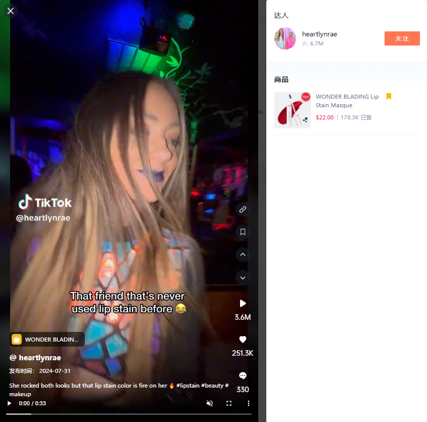 @heartlynrae的视频发布于7月31日,嘀嗒狗后台观察到该视频目前的播放量达到了25.1万。在视频中,我们可以看到在使用了这款产品之后,即使用纸巾直接去擦,也难以使唇彩暗淡或者失色,效果非常强!