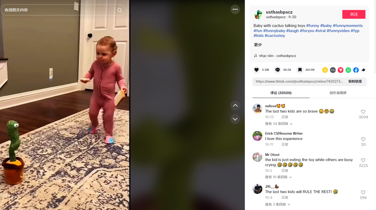 玩具在任何地方都是非常受大众喜爱的快乐不分国界,当一款在国内非常常见、深受孩子们喜爱的的儿童玩具出海到国外时,同样也激起了不少关注。 9月30号,TikTok上发布的一款搞怪仙人掌的视频引起网友的关注,其播放量高达1.59亿次,点赞高达330万,视频中不少宝宝被仙人掌玩具突然跳起舞来并发出搞怪声音的场景吓到,这一反应引得观众们忍俊不禁,笑声连连。