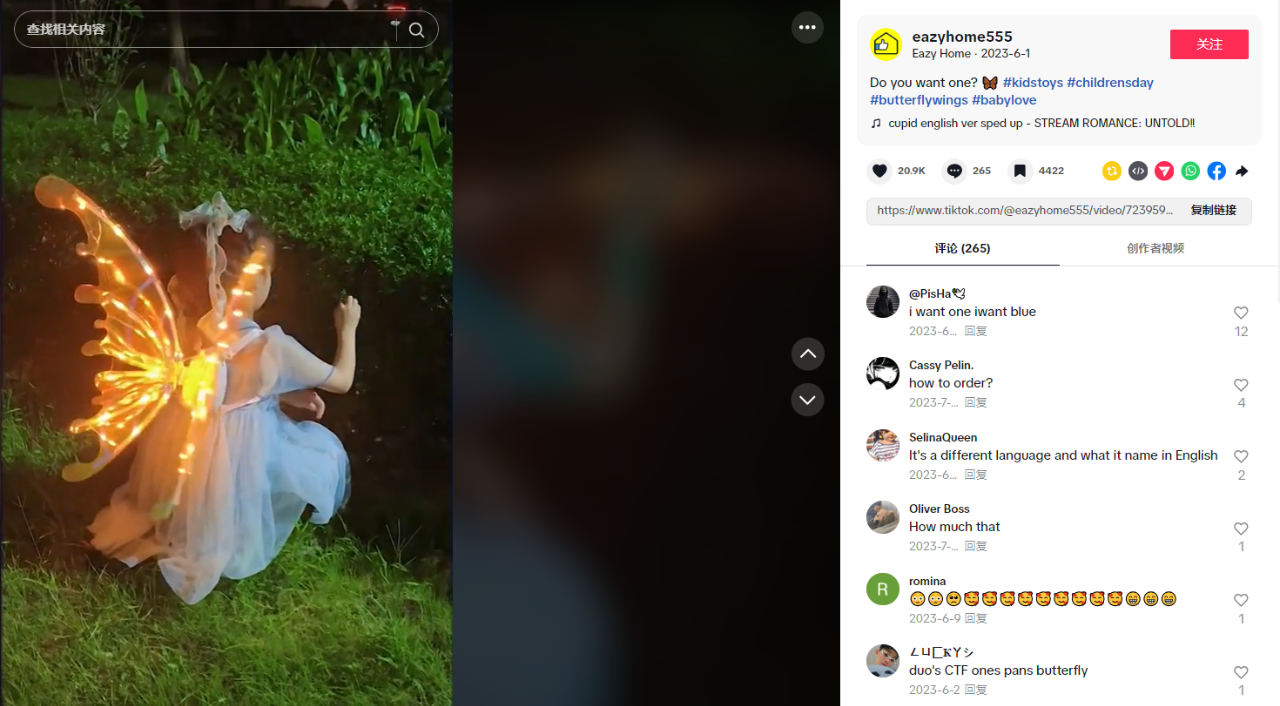 TikTok上关于这款产品的视频数量高达1.28万条,其中博主@eazyhome555展示了该产品的具体组装过程。简单地将两个翅膀与中间的电子电池安装拼接起来,轻触开关,即可点亮灯光,同时蝴蝶的双翼能模拟真实蝴蝶般来回颤动。在夜晚佩戴上这对小翅膀外出,瞬间吸引了路人的目光与好奇。 评论区随即涌现出大量网友的询问,“如何预定同款产品”“这款产品叫什么名字,去哪里可以买到?”纷纷表达了对这款产品的浓厚兴趣。其实儿童玩具出海早已不是稀奇事,播放量较高并处于首页推荐的视频大多是国内品牌,更有很多网友询问如何去订购。