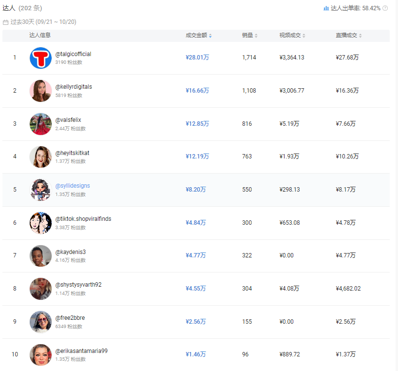 从TikTok平台数据展示,过去30天内,共有202条该产品的带货短视频。在成交金额排名前十的达人中,其中排行第一的达人@talgicofficial,粉丝数量仅有3195人,属于尾部达人,销售金额在28.05万元,这一数据表明,无论粉丝量多少,只要能够精准触达目标群体并取得信任,都可以带来可观的销售业绩。