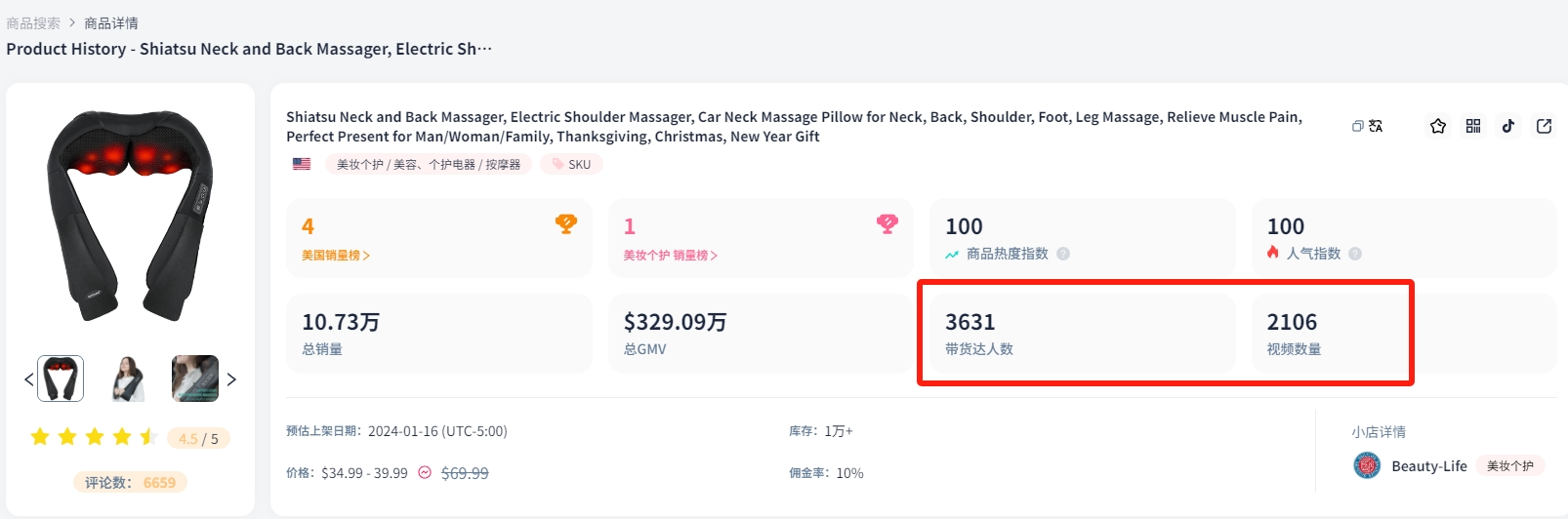 从功效上看,该款产品与大多按摩仪类似,通过为颈部、肩部、腰部等问题部位深度揉捏按摩,舒缓肌肉酸痛。在按摩时,消费者也可自行选择加热或不加热按摩,增加使用时的舒适度,附带的遥控器也可轻松操作。 另外,该产品能够在海外受到广泛的关注和欢迎,一定程度上也与网红达人的宣传有关。据Fastmoss数据显示,在过去的28天中,有1528位网红发布了与此产品相关的视频或直播,而在与该产品有关的2618场直播里,该商品销量新增1.08万件,销售额新增$34.52万。