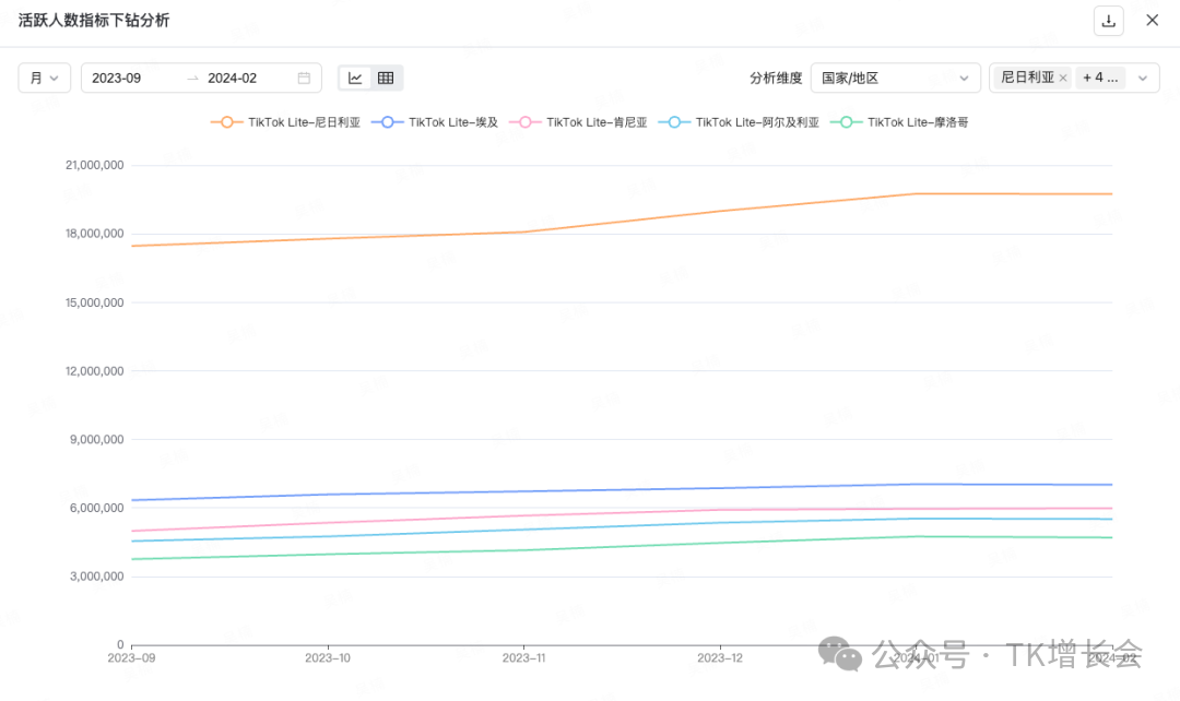 图:TikTok Lite非洲Top5国家月活跃用户规模变化