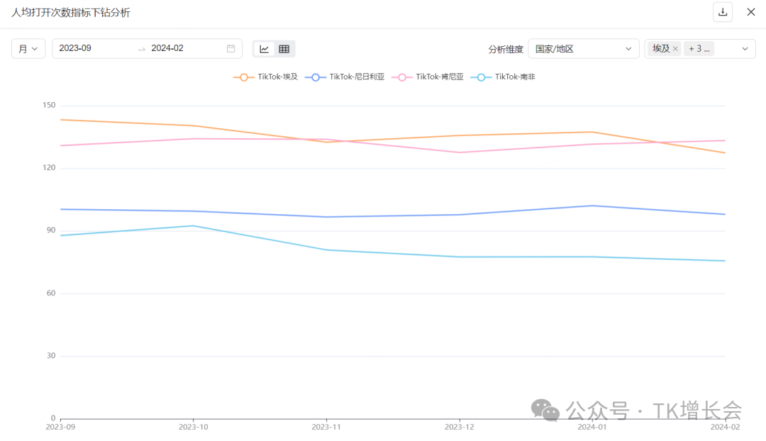TikTok在非洲地区也推出了迎合用户内容消费习惯且使用门槛较低的Lite版本,但Lite版本的使用人数相对较低。 由于网络和流量限制,TikTok Lite在尼日利亚的受欢迎程度更高,2024年2月TikTok Lite尼日利亚月活跃用户数量超1900万,埃及紧随其后,月活用户数超700万。 Data Sparkle数据也显示,2024年2月,在非洲四大主要国家中,TikTok在肯尼亚的人均打开次数已超越埃及位居榜首,月人均打开次数超130次,成为TikTok在非洲市场的一个重要亮点。