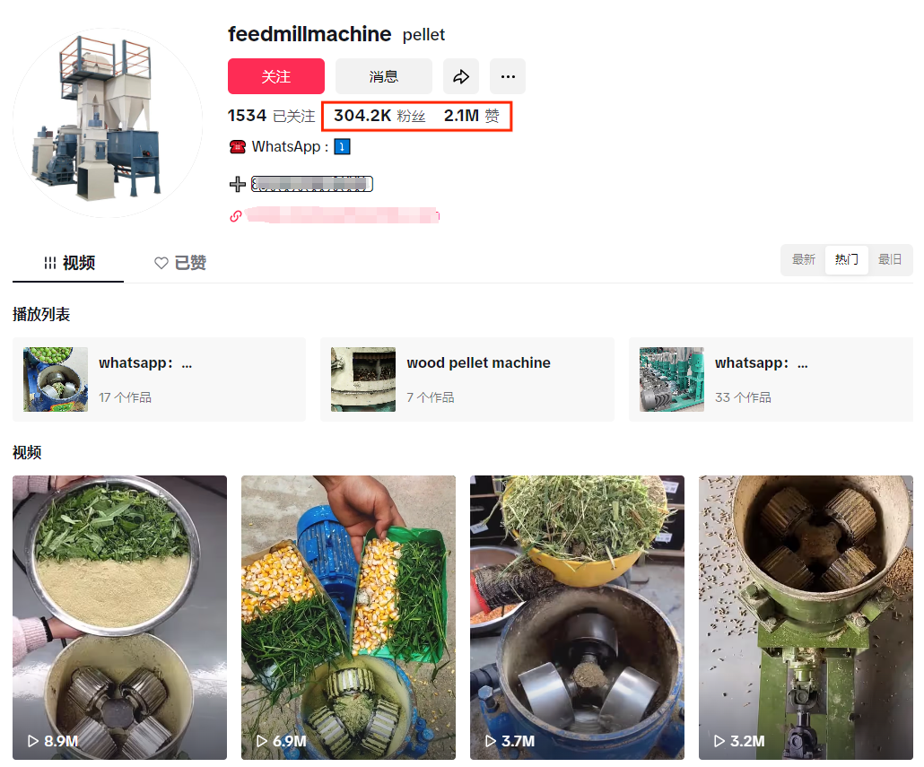 随着数字化时代的到来,雪鸮意识到传统的业务拓展方式需要与时俱进。 为此,他们不仅加强了产品的技术研发,同时也在全球最大的短视频平台TikTok上开启了创新营销之旅。 这一转变不仅扩大了他们的市场影响力,还展示了公司从传统制造向现代数字化营销的顺利过渡。 雪鸮的TikTok账号@feedmillmachine目前已拥有超过30.42万粉丝,并累计获得210万次点赞。其中一条展示饲料颗粒机运行过程的视频,播放量高达890万次,成为真正的爆款内容。