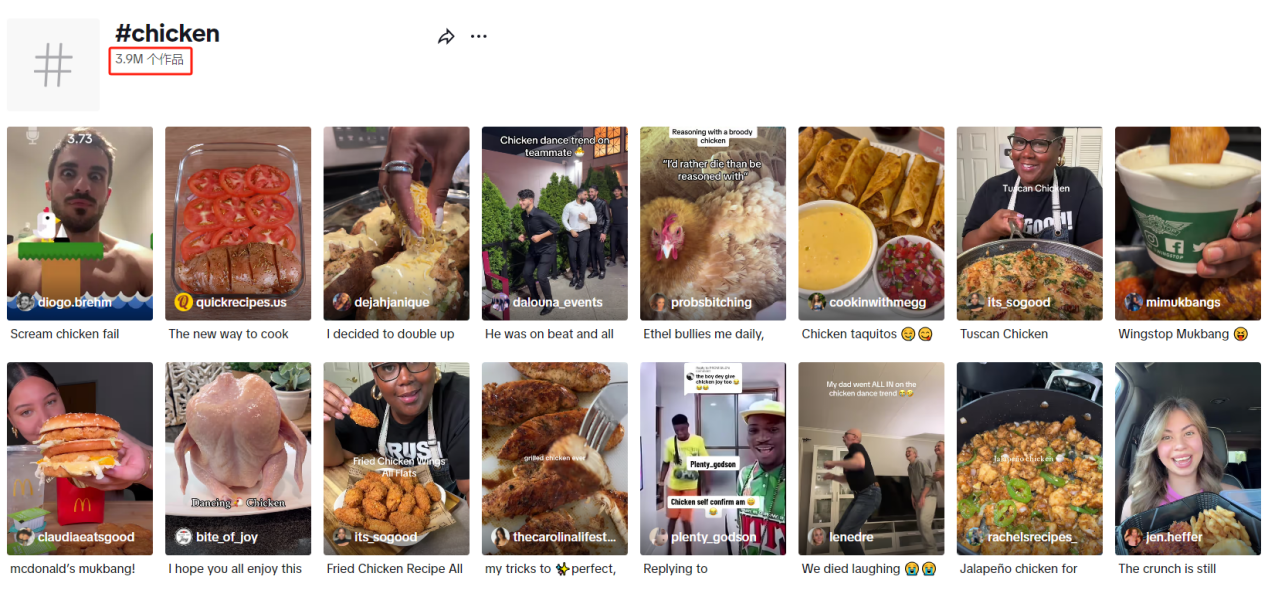 作为一家饲料颗粒机的制造工厂,雪鸮成功抓住了TikTok上的热门趋势,掌握了国际消费者的兴趣和市场动向。 雪鸮的策略是利用#chicken这一标签来推广其饲料颗粒机,虽然这个标签常常与鸡肉食品相关的内容挂钩,但雪鸮的机器操作视频因其独特性而在众多美食视频中脱颖而出。 这些视频捕捉了玉米和蔬菜被转化为颗粒状饲料的过程,这种视觉上的满足感使得这类解压内容在TikTok上尤为受欢迎,有效吸引了大量观众的注意。