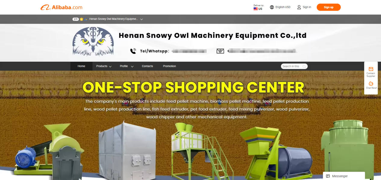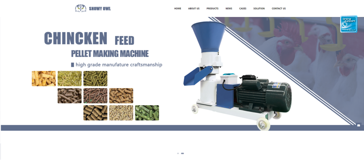 此外,雪鸮还搭建了独立站,展现了公司的详细企业资料和产品介绍,突出显示了他们的主打产品如饲料颗粒机和饲料生产线的功能与优势。网站内容丰富,旨在为全球客户提供全面的信息,帮助他们了解雪鸮的技术实力和产品种类。