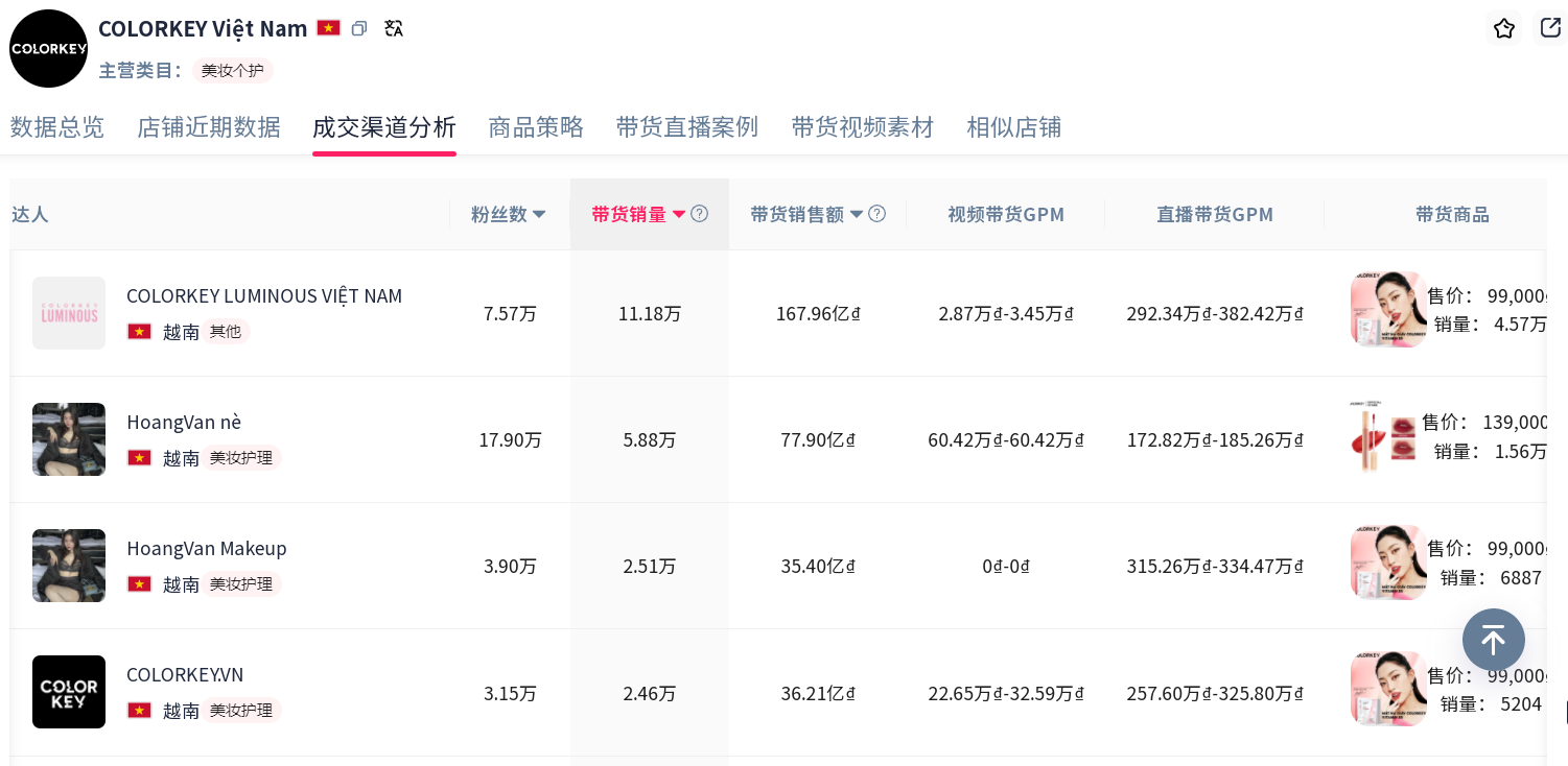 再加上珂拉琪另一越南小店“COLORKEY LUMINOUS VIỆT NAM”的表现,数据显示,从2023年12月到2024年9月,珂拉琪在越南的月销量涨幅超过217%,销售额涨幅更是达到了400%。 这些成绩的取得,离不开珂拉琪对海外市场的深入洞察和对消费者需求的精准把握。在TikTok平台上,珂拉琪与众多越南美妆达人合作,通过短视频挑战赛、直播带货等方式,成功将品牌推向了新的高度。目前,和珂拉琪越南小店关联的达人已经有3400个,关联视频将近6000个,关联直播也有数百场。