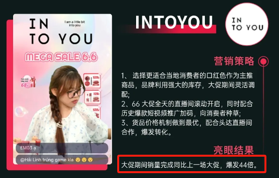 毫不夸张地讲,海外消费者在购买国货彩妆这方面上已经“成了瘾”。 在6.6越南电商大促中,越南带货主播武河玲(Võ Hà Linh)直播带货4小时,创下单场销售额达400万美金的历史新纪录。在这份成绩单上,卡姿兰、橘朵等中国彩妆品牌的表现相当亮眼。在TikTok Shop6.6东南亚生日大促中,INTOYOU成了超级热卖品,大促期间,品牌销量相比上一场大促,同比激增44倍。
