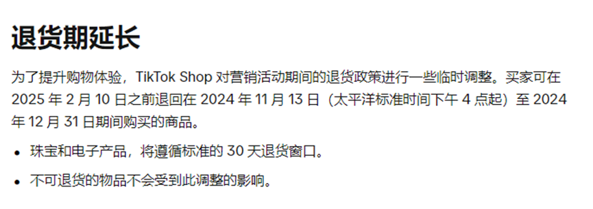 首先,TikTok Shop美国站将在北京时间2024年11月14日至2024年12月3日期间延长标准订单履约时效,卖家发货时间从3个工作日增至4个工作日,自动关单期限也从订单日起的7个工作日延长至8个工作日。此外,考虑到旺季期间卖家工作量暴涨,TikTok Shop还贴心的延迟了履约率时效更新,只要卖家能提供有效物流追踪号即可避免延迟发货处罚。 其次,TikTok Shop还延长了旺季订单退货期限,除了珠宝、电子产品等需要遵循30天退货窗口规定的产品,其余在指定日期内购买的商品都可以在2025年2月10日申请退回。与之相对应的,退货订单在途时间窗口和退货退款审核窗口也会往后延,以给予卖家更多时间处理售后问题。