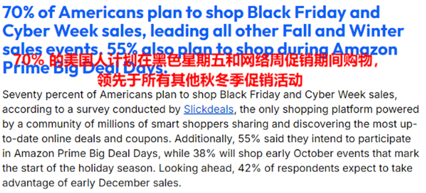 事实上,年底旺季大促包含黑五、网一、圣诞等多个重要节点,向来是卖家争夺市场份额的关键时机。 根据贝恩此前发布的研究报告,预计今年黑五网一大促活动期间,美国市场的零售额将同比增长5%,整体销售金额有望突破750亿美元大关。 而美国在线交易和折扣信息分享平台Slickdeals的一项调查则显示,七成美国消费者已经计划在今年黑五和网一促销活动期间购物。