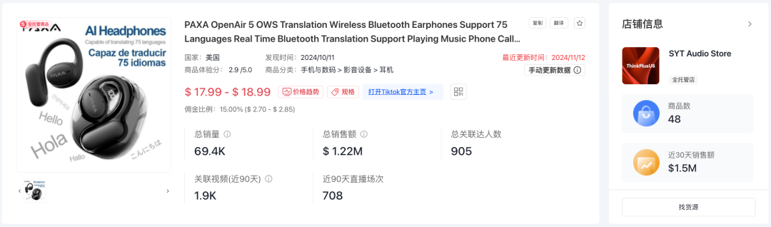 根据Tabcut数据观察,最近在TT美区的商品排行榜上,出现了一款爆款商品,商品标题为【PAXA OpenAir 5 OWS 翻译 无线蓝牙耳机 支持 75 种语言 实时蓝牙翻译 支持播放音乐 打电话 耳机】,上周销额排行榜第四名,近30天销售额达到了120万美金。
