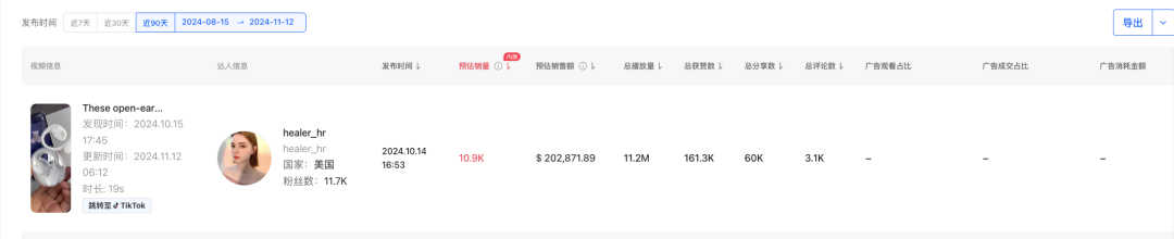 近90天,这个达人的视频带来了极大的播放量,我们可以看一下这个最火的一个视频,具体是展示了产品的功能和使用,商家模仿拍摄是容易复制的。 [mcv_dplayer source="https://img.tkfff.com/2024/11/11月15日-1.mov" width="100%" height="500"]视频来源于TikTok