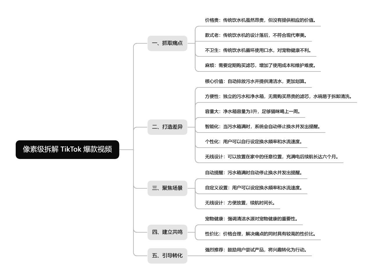 下面开始像素级拆解,逐句分析视频文案:(思维导图后面自取) “这就是为什么即使是最贵的传统饮水机也只能给你的猫喝带有唾液的水,而且你还需要为它们购买滤芯。
