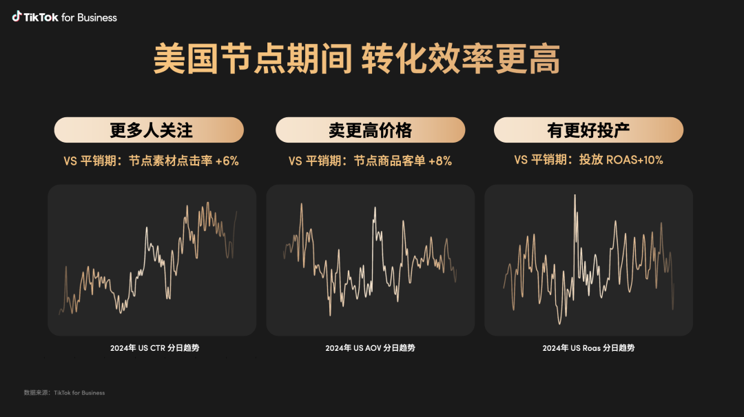节点的销量爆发明显,TikTok 官方数据显示,23年初次开启的美区黑五,带来了40%的 GMV 增长,大节点的销量膨胀系数达到1.5。 但大促的含义不仅仅在于销量增长,黑五在海外具备广泛认知,自带流量,转化效率表现也更加突出:TikTok 美区数据显示,大促期间的曝光、客单价和 ROAS 都较平销期有明显增长。