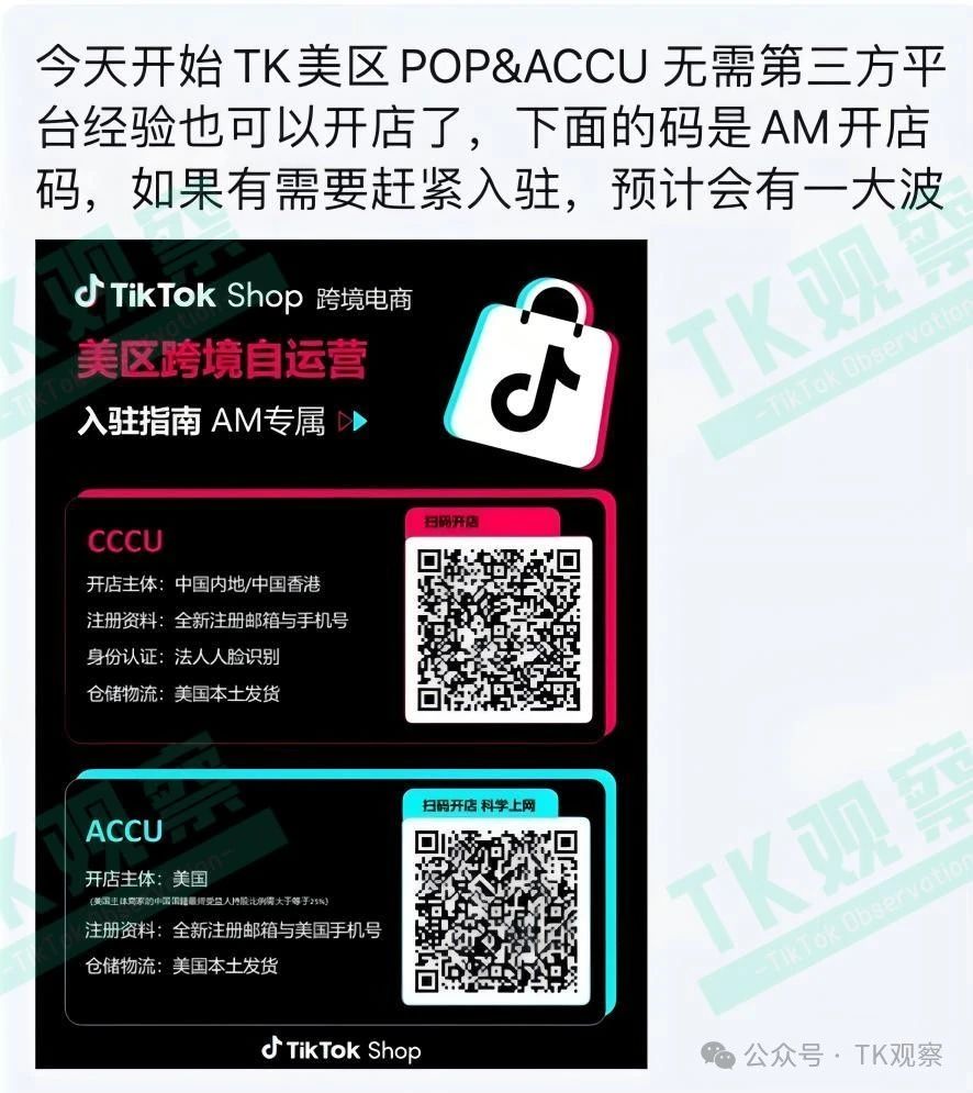 就在最近,TikTok美区跨境店大幅降低门槛的消息,一下子让中国商家们沸腾了,很多原先达不到要求想要做TikTok美区市场的商家们可以重点关注。 据了解,新的TTS美区跨境店,无需第三方平台经验也可以开店了。具体的入驻方式有两种,一种是Accu店(美国公司主体),另一种是CCCU店(中国内地/香港主体)。这两种模式均需要美国本土发货。 之前如果要在TikTok开美区跨境店,对于第三方平台的资质和流水要求还是比较高的,如果是没有跨境亚马逊Ebay等平台经验的卖家,也是需要抖音等国内电商体量较大的玩家,还得通过“特批”的方式去申请开店。而这次的门槛降低,基本上是TikTok在美国开展电商以来门槛最低的一次。