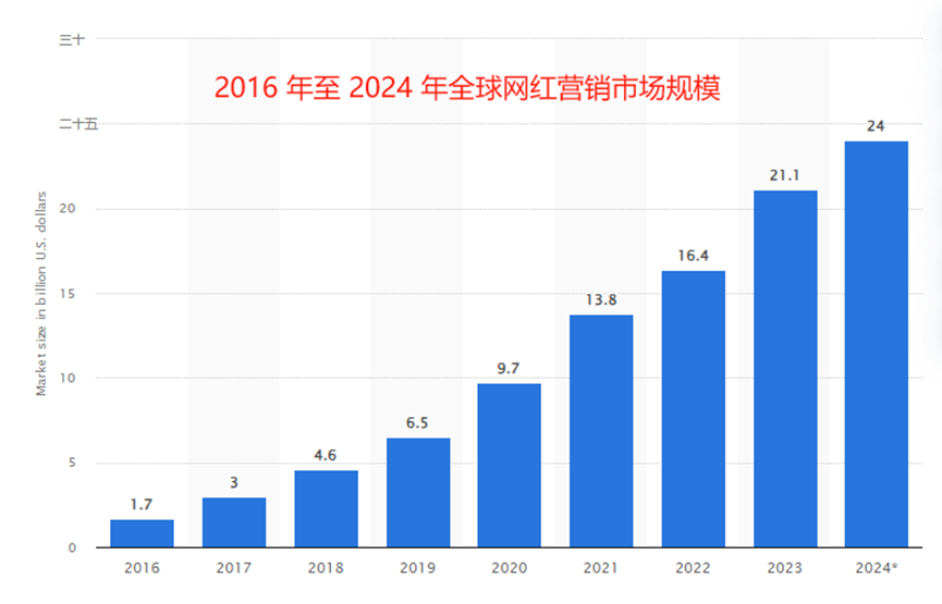 当然,大家也不要小瞧了网红营销市场,要知道,虽然网红营销的广告支出仅仅是传统社交媒体广告支出的一个小部分,但其带来的推广效果往往立竿见影,在此前提下,网红营销也得到越来越多品牌的青睐。 Statista的数据就显示,全球网红营销市场正驶入高速发展轨道,从2019年的65亿美元到2022年的164亿美元,仅用三年时间就实现了市场规模的翻倍增长。预计到2030年,网红营销的总价值将超过210亿美元。