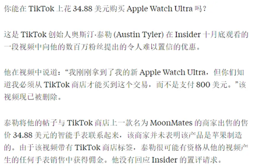 由此可见,网红营销已经成为跨境电商领域一股不可忽视的重要力量,包括TikTok在内的多家平台都有意在培养自己的网红生态体态,以提升平台的商业价值。 不过,通过互联网影响力者来提升品牌曝光和销售转化率虽然是一种有效的策略,但在信息高度透明的互联网时代,“只要营销做到好,垃圾也能卖成宝”的套路已经不再奏效。不久前,一位名为在TikTok宣传山寨苹果手边的网红Austin Tyler就惨遭翻车,据悉,该手表正品售价为800美元,但他宣传的假货售价仅为34.88 美元。