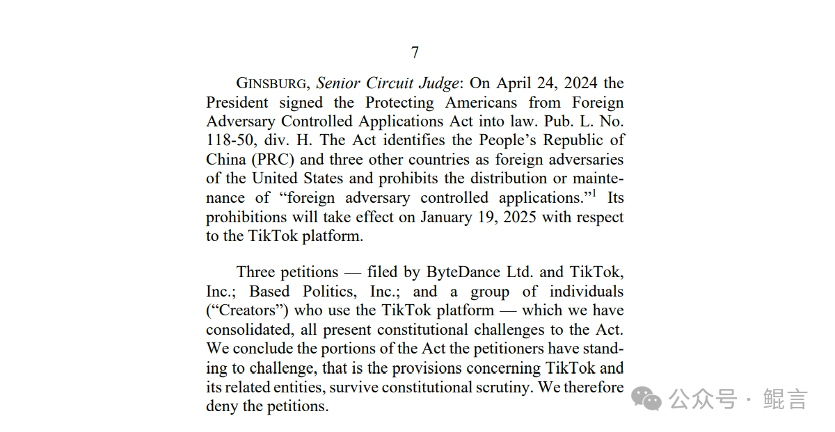 TIKTOK的联邦法院判决出来了,美国联邦上诉法院驳回了字节跳动和TIKTOK对于美国政府要求剥离TIKTOK否则禁止其运营的法案的挑战,认为美国政府剥离令并未违反美国宪法第一修正案,美国政府颁布的对TIKTOK“不剥离就禁止”的法案是对美国国家安全的正当保护。