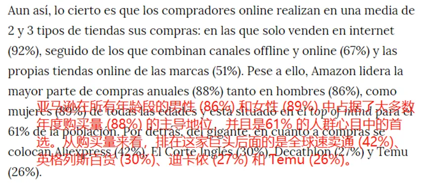而在西班牙电商市场中,亚马逊占据着十分重要的地位。 据Elogia公布的西班牙电商市场分析报告显示,有61%的西班牙消费者将亚马逊视作网购首选平台。从消费者年度购买量来看,亚马逊同样以88%的份额占比遥遥领先,紧随其后的则是速卖通、英格列斯百货、迪卡侬和Temu。
