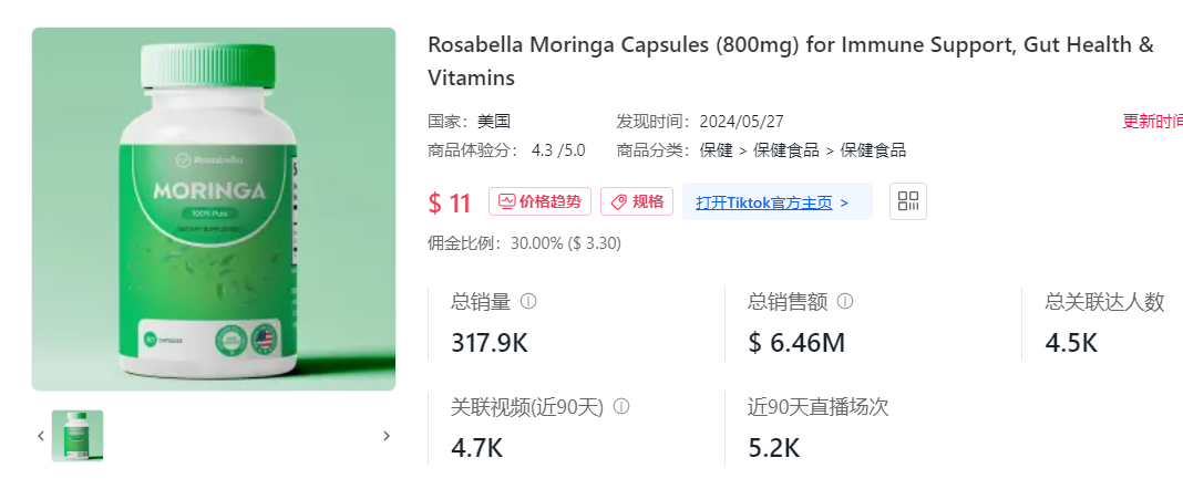 的榜一单品是客单价14.22 美元的保健品“Rosabella 辣木胶囊”