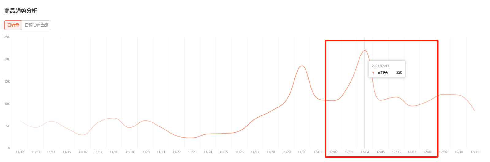 在周期内均能保持 1 万+ 的出单量,其中最为瞩目的是在 12-4 这天,商品