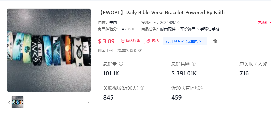 首先是位列榜单第七位,一款客单价 3.89 美元的“圣经经文手环”。