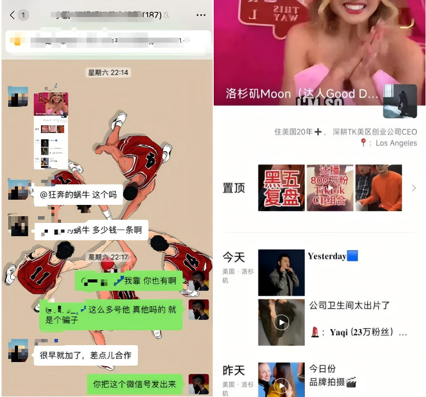 12 月 14 日,有同行卖家在群里爆出了这位“洛杉矶 Moon 老师”另外一个微信号,两个账号发的内容和以及人设几乎一模一样,朋友圈也在正常更新中。“原本心里也有一定预期,没指望钱花出去这些视频能为我们带来多好的结果,但他们连一个视频都没有交付,这就有点说不过去了。”