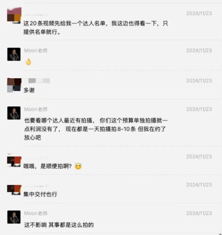 在后续多次要求提供具体的达人名单和达人过往产出的带货视频和 GMV 表现,并尽快安排专人对接时,对方却一直以黑五太忙,达人需要集中安排到棚内拍摄,要看达人的档期和意愿等等这些理由来搪塞,进度一度被搁置,就连之前已经提供过的百万网红也一直没有交付视频。“应该没见过我这么卑微的甲方吧。”Adam 自我调侃道。