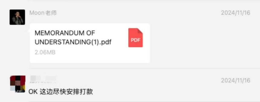 11 月 16 日,对方提供了美国公司收款账号,11 月 18 日,Adam 按照协议成功打款 4200 美元的定金。