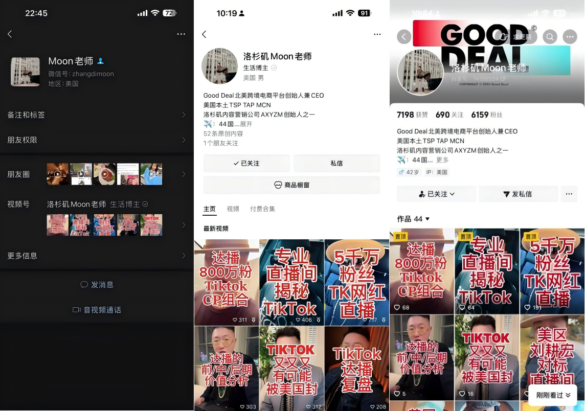 正文开始前,我们先放出由被骗卖家 Adam 提供的,微信号&视频号&抖音号 ID 为“洛杉矶 Moon 老师”的截图,提醒各位 TikTok 美区跨境同行避雷。