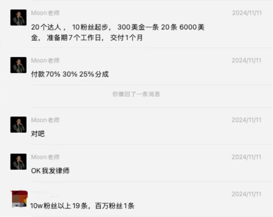 由于前期准备时间过长,加上产品在 TikTok 美区的销量一直没有太大起色,期间后台达人建联效率很低,达人产出的视频数据也表现一般,Adam 心急如焚。在进一步沟通合作意向后,即便对方要求预付高达 70% 的定金,Adam 仍然与这位“洛杉矶 Moon 老师”达成了合作:20 条视频,合作金额为 6000 美金,其中 19 条 10 万粉丝+1 条 100 万粉丝,双方商议过后将原本 30% 的佣金比例降低到了 25%。