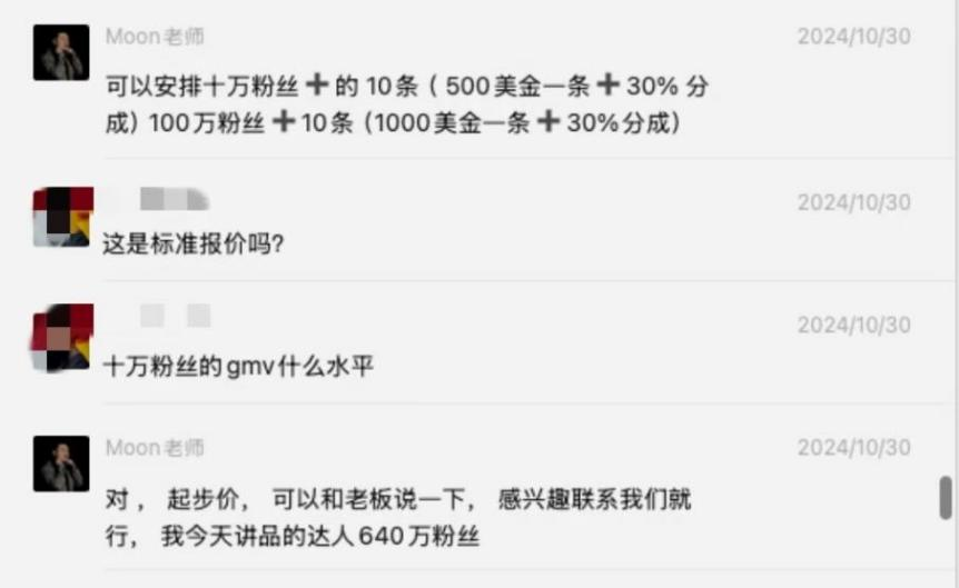 由于“洛杉矶 Moon 老师”表示要先看过样品后再考虑后续进一步的合作,10 月 29 日,在产品入仓后,Adam 寄出了 5 套样品并在一周后咨询产品团队的反馈,对方表示选品团队和达人都很看好这个产品,随后声称可以安排 10 万+粉丝的 10 条(500 美金一条+30% 分成)和 100 万+粉丝的 10 条(1000 美金一条+30% 分成)。