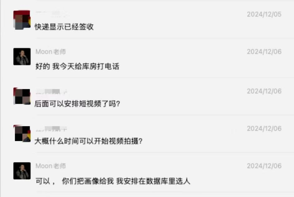 慢慢地,Adam 感觉到了这家 MCN 机构在执行和沟通上的一些异样,但已经交付定金的他陷入被动局面,只能耐住性子等待。在对方表示合作的 20 位达人需要再看看产品时,Adam 再次寄出了 20 套样品,12 月 6 日,样品成功送达后,Adam 多次联系交付视频,然而,这位“洛杉矶 Moon 老师”已经不回复任何微信消息,但也不删除不拉黑好友,只是视频号和抖音号仍在正常更新动态,这让 Adam 百思不得其解。
