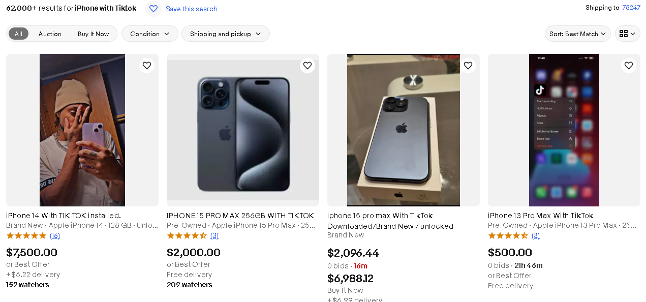 据路透社报道,许多希望这一商机的卖家在 eBay 平台上高价出售已经安装该应用程序的二手手机。截至目前,在 eBay 输入“iPhone with TikTok”这一关键词时,搜索结果已超过 62000+ 条,不同型号的 iPhone 手机售价大多从 500 美金到 3 万美金不等,其中,一台声称同时配备了 TikTok 和 CapCut 应用的 iPhone 15 Pro 标价更是高达 5 万美金,远超手机本身的市场价格。