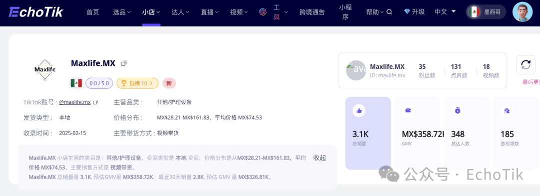 据Echotik数据显示,一款筋膜枪在墨西哥 TikTok 上爆卖,产品来源于一家名为Maxlife.MX(@maxlife.mx)的小店,20天前上架,共计售出3100件。