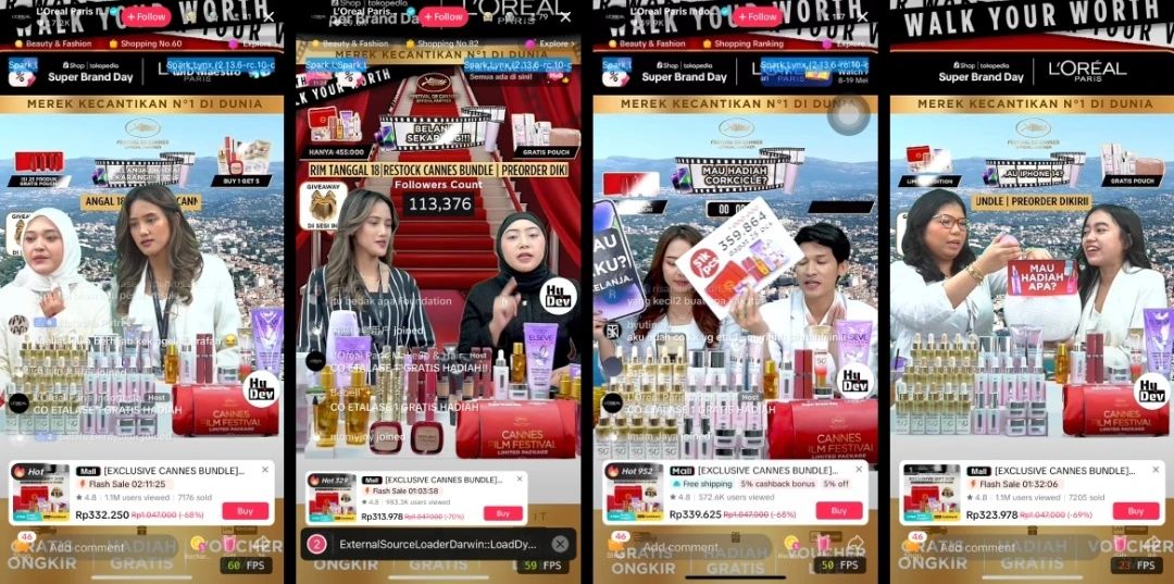 在活动前期,TikTok Shop团队就基于ACE方法论,为品牌提供了基于数据的消费者洞察和经营效果分析,得出了一套有针对性的营销方案。活动期间,欧莱雅推出了以“戛纳x超级品牌日”为主题的大型线下主题活动,并特定邀请到印尼家喻户晓的明星@cintakieh和@jannahcochrane出席,将超品日带到戛纳,成功预热了本次超级品牌日戛纳活动,活动总曝光量达到5亿。线上,以戛纳电影节为直播室主题装饰,让用户仿佛身临其境,令直播观看量增加超400%。