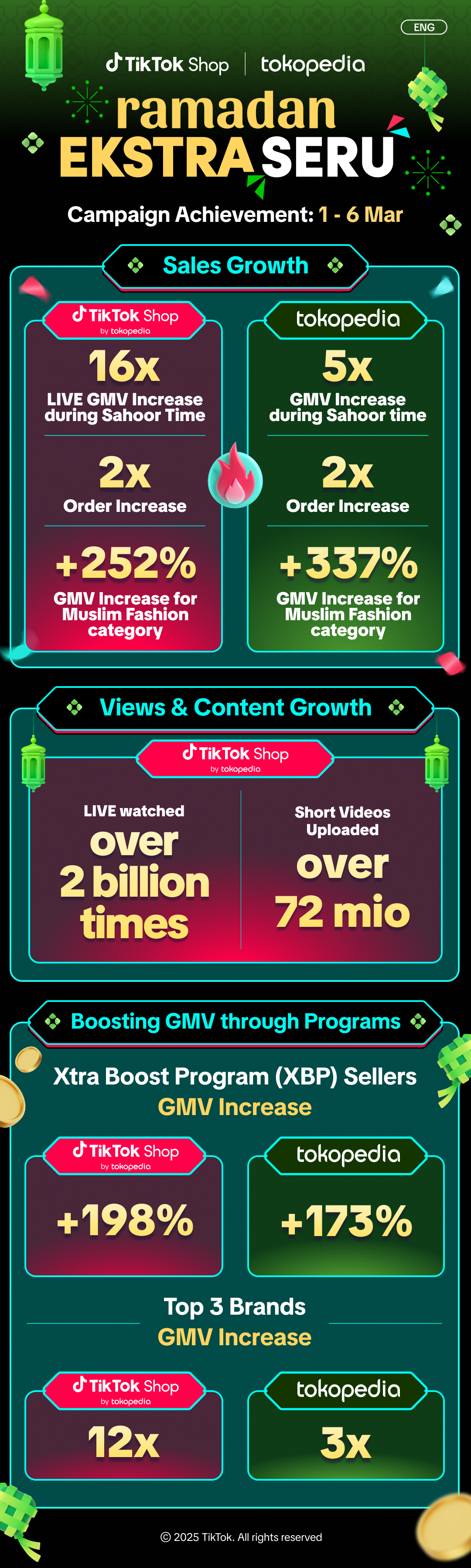 TikTok Shop印尼本地业务与Tokopedia融合后也一直保持强劲的发展势头。此次在印尼推出的2025年斋月大促活动,将从2月24日持续到3月25日。众多国际品牌与本地商家踊跃参与,在平台丰富的可购物内容生态、多场景达人种草营销、对消费者需求的敏锐洞察等优势的加成下,取得了令人瞩目的成绩。