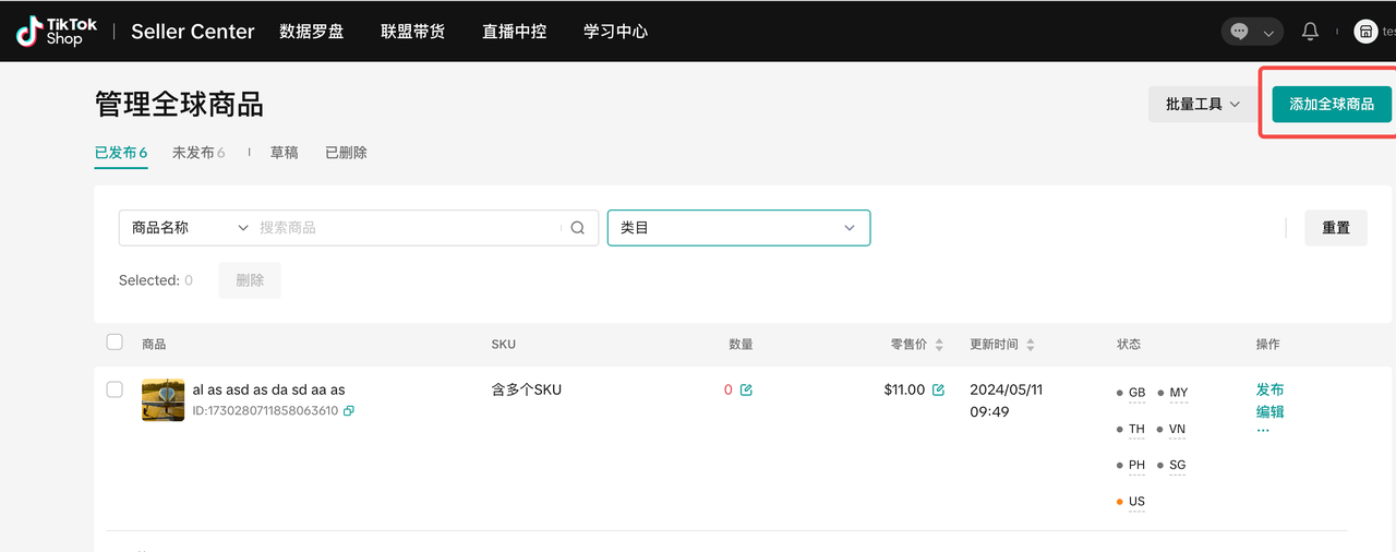 | 第一步:做好选品 | 1-7天 | 参考TikTok Shop站内爆款/商家独立站/美区电商平台的爆款迅速上架商品,选出3-5个主推款与联盟达人合作 | 上架商品~10-20个联盟达人主推带货商品~3-5个 | 操作路径:「商家后台」-「管理全球商品」-添加选品![]() |