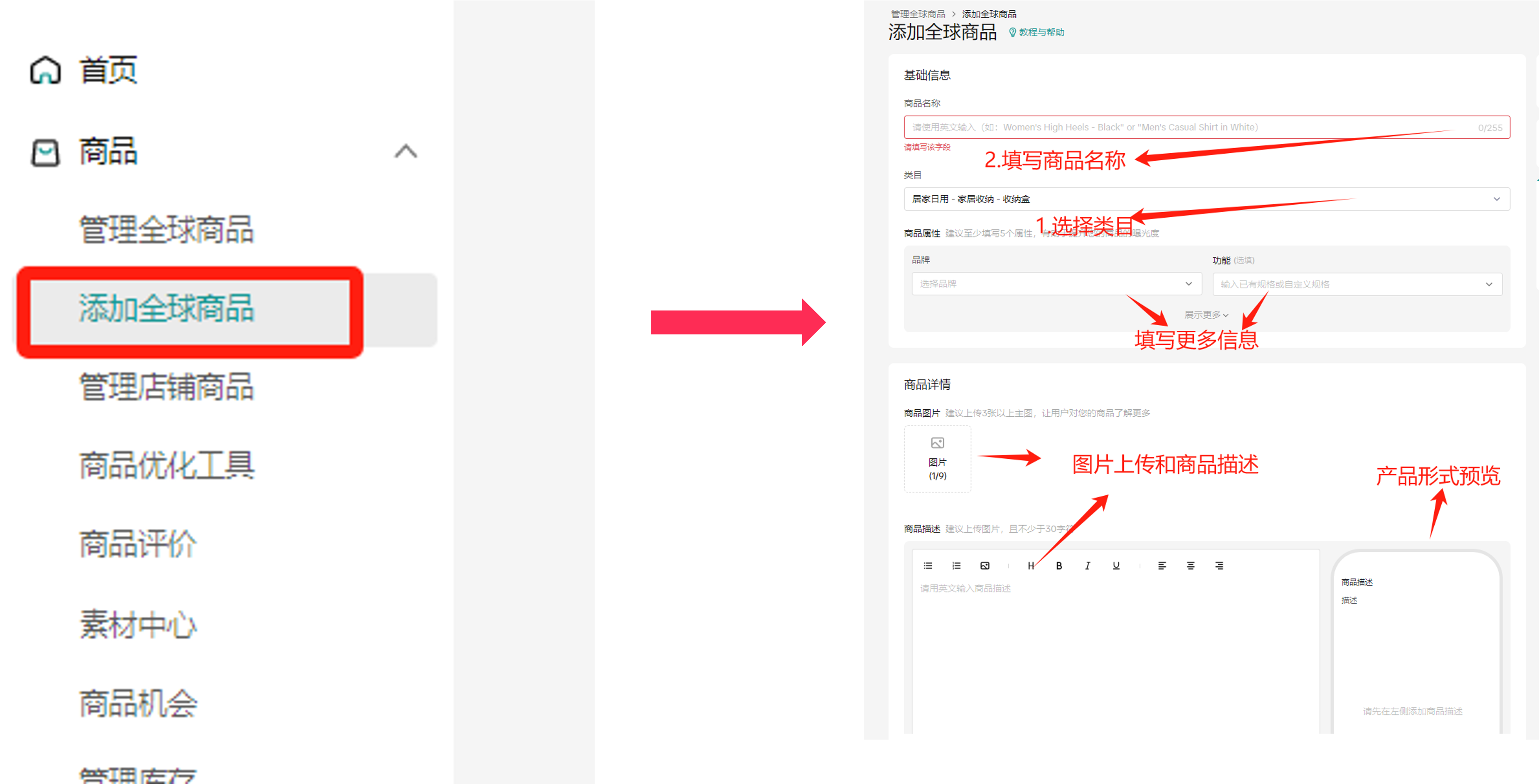 | 商品描述 | 字符数:至少500字符 基于“关键字+详细描述+图片”的形式提供3-5个产品卖点 关键字应概括产品的主要功能或特性之一 详细描述需扩展关键字并做好分段,每个小段落前提炼产品优势或加粗关键词以提高可读性 附图需要展示商品的其他角度、产品配件、材质、尺寸、主要产品功能、使用场景、特写等建议上传5张高清图片。 建议上传视频,大小不得超过100MB |