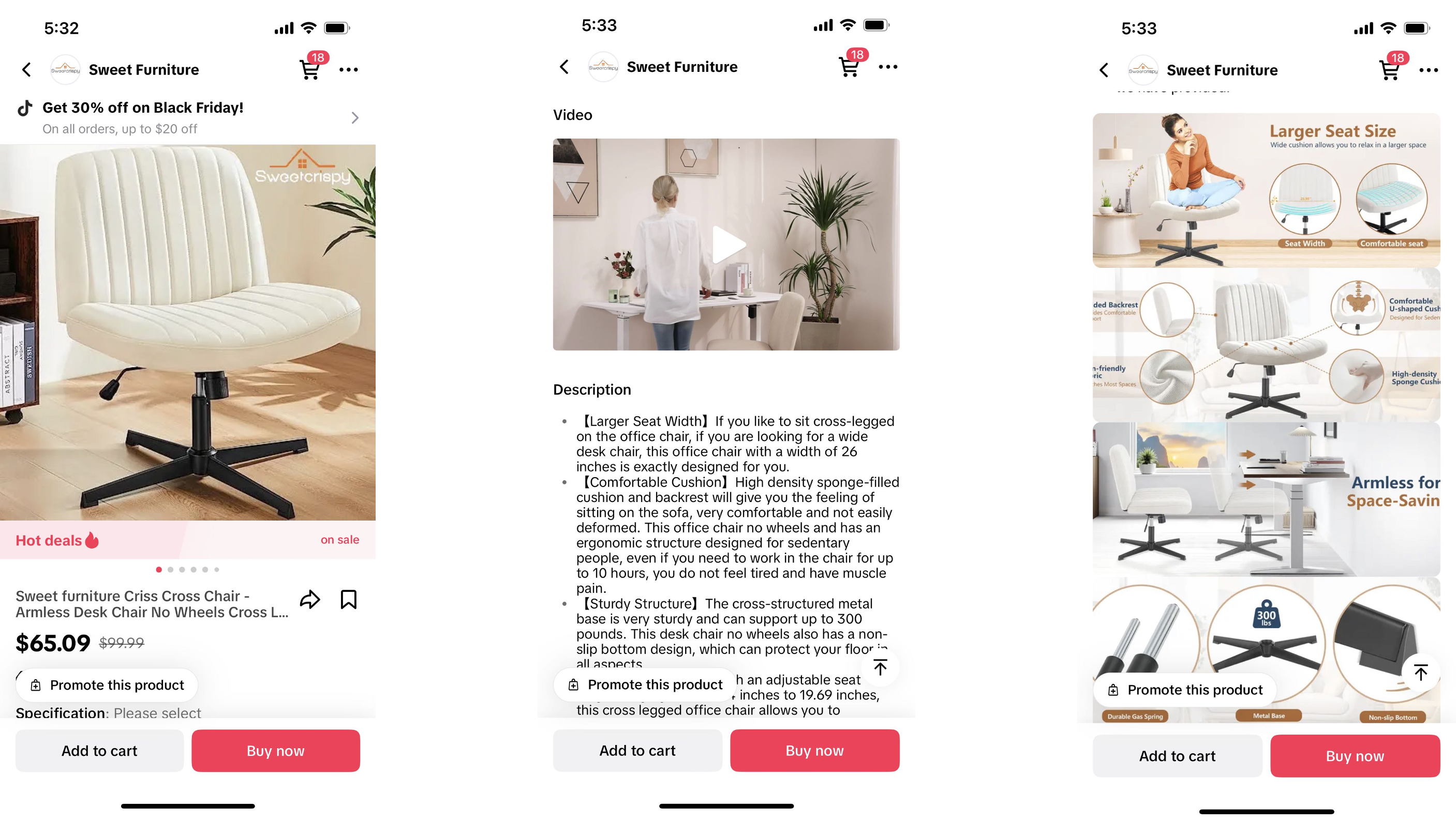 商品详情页(Listing)是用户在您的店铺中查看特定产品的详细信息时所看到的页面。每个产品都有自己的页面,页面上提供完整且相关的细节信息,包括产品图片、标题、价格、视频(产品展示外观/功能)、描述、变体、销量等。