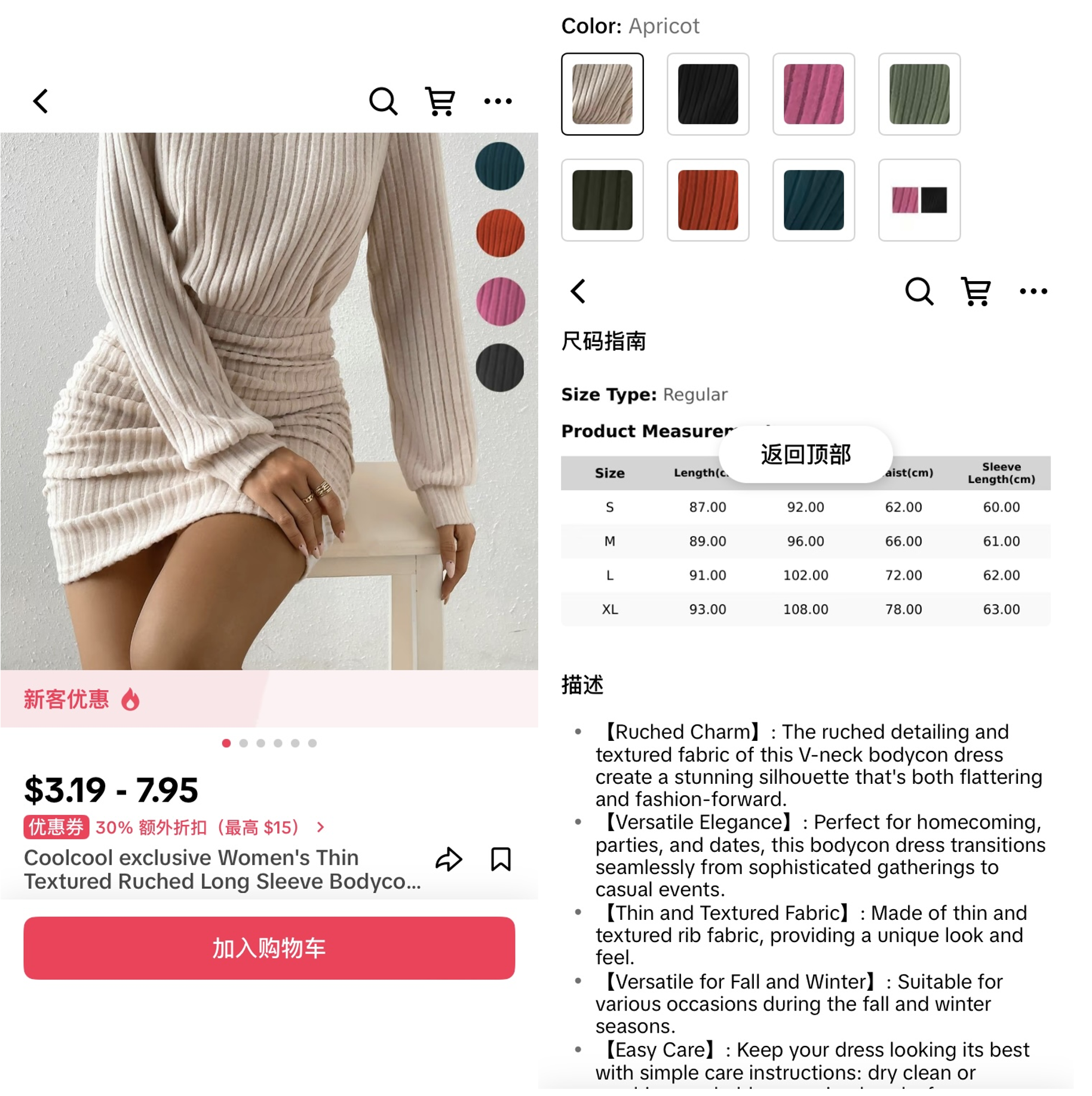 商品详情页描述清楚、图文并存,分段合理且文本≥500字符(买家在选择特定产品类型时做出购买决策所需的必要信息,如:服饰需有详细的服饰尺码表)