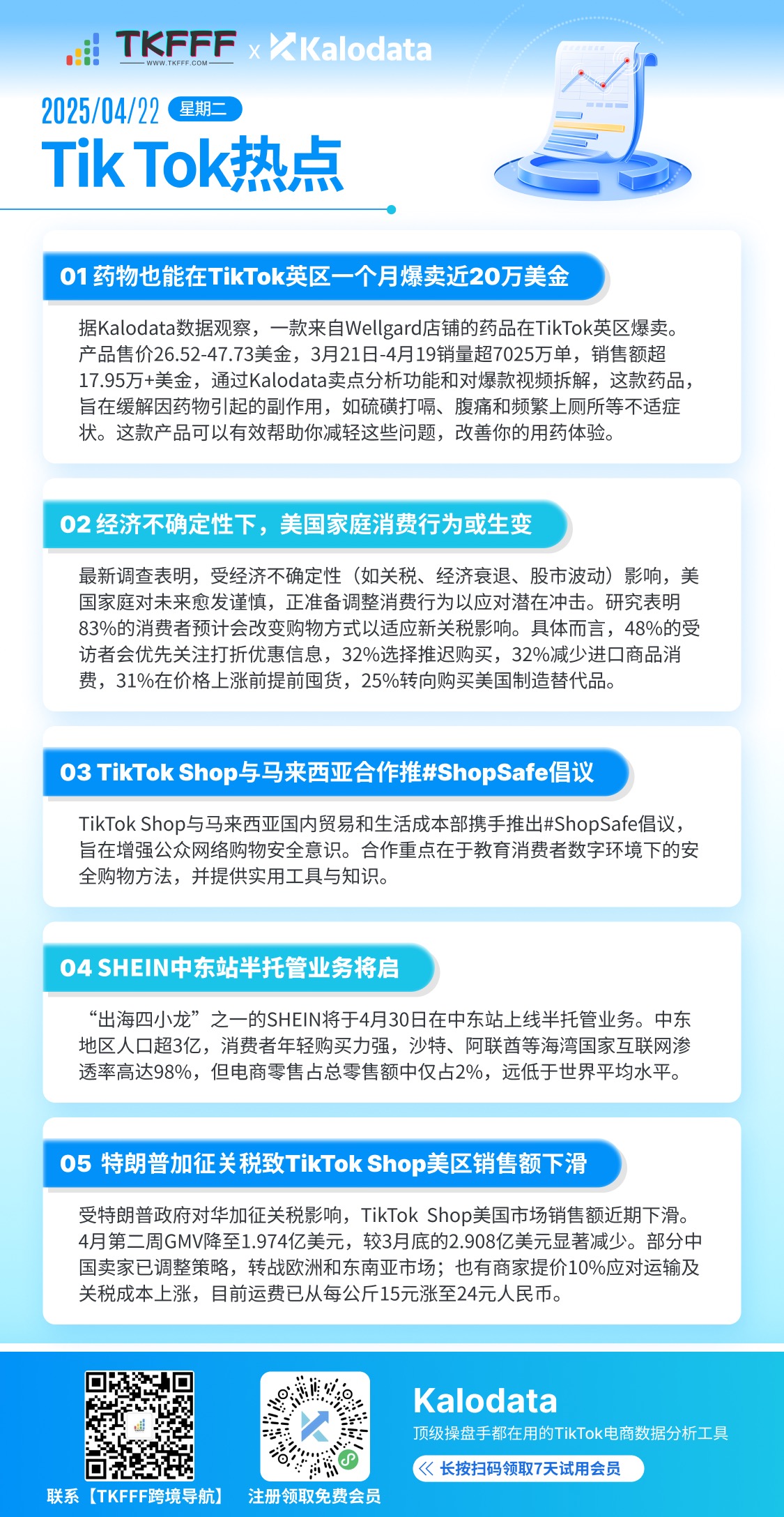 1、药物也能在TikTok英区一个月爆卖近20万美金 2、经济不确定性下,美国家庭消费行为或生变 3、TikTok Shop与马来西亚合作推#ShopSafe倡议 4、SHEIN中东站半托管业务将启 5、特朗普加征关税致TikTok Shop美区销售额下滑