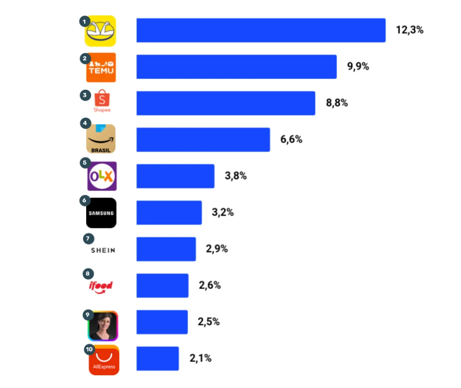 Temu的增长速度堪称惊人。3月数据显示,该平台以7.8%的流量份额超越亚马逊,首次跻身巴西第三大电商平台,而仅近一个月后,其流量份额便迅速攀升至9.9%,成功超越Shopee再进一步。这一系列突破性进展充分展现了Temu在巴西市场强大的渗透能力和与日俱增的影响力。