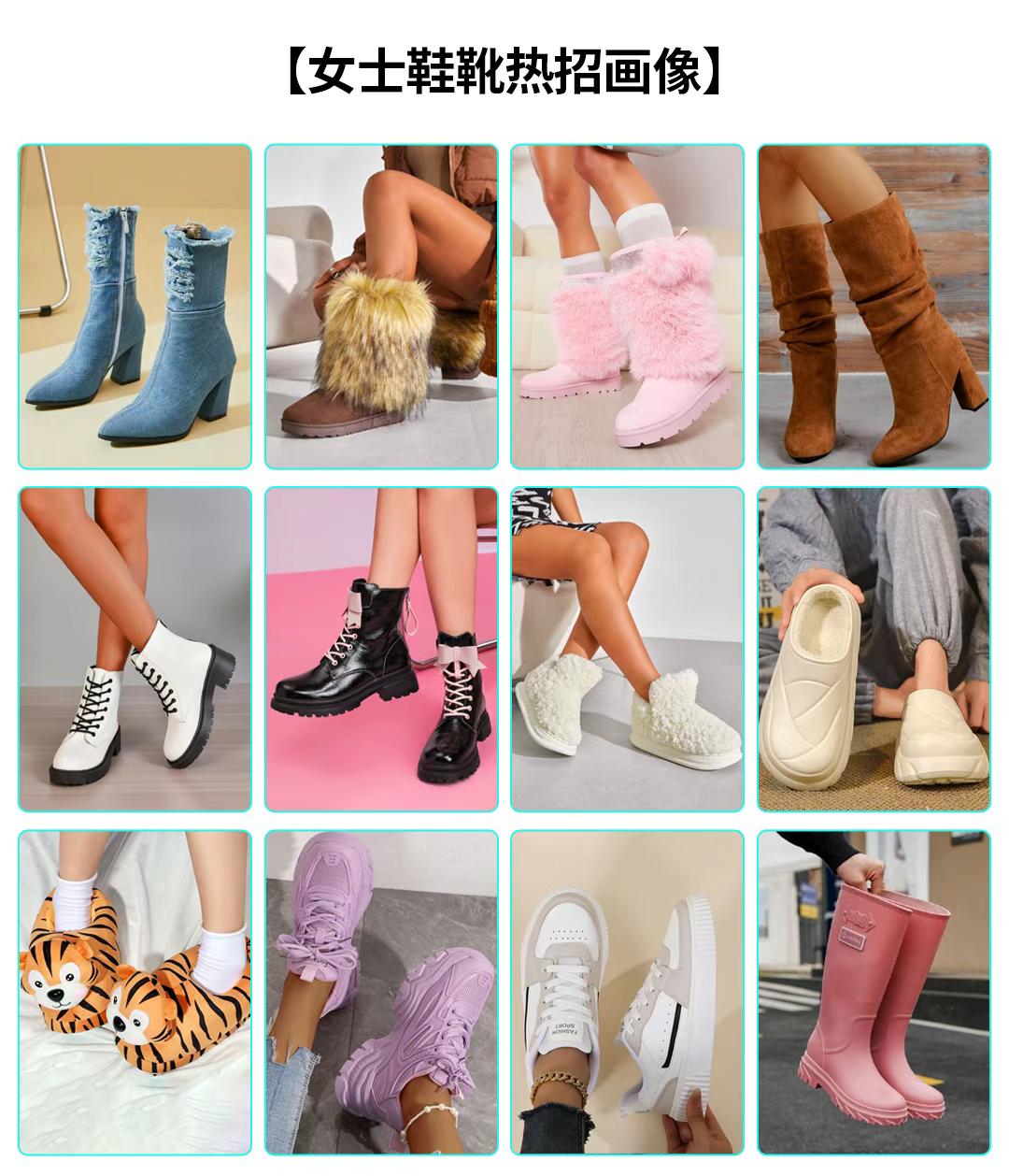 女士鞋靴:主推时尚靴、拖鞋、单鞋,强化西部靴、踝靴、大码靴等细分场景;风格聚焦时尚休闲+百搭通勤,融入复古元素提升差异化。