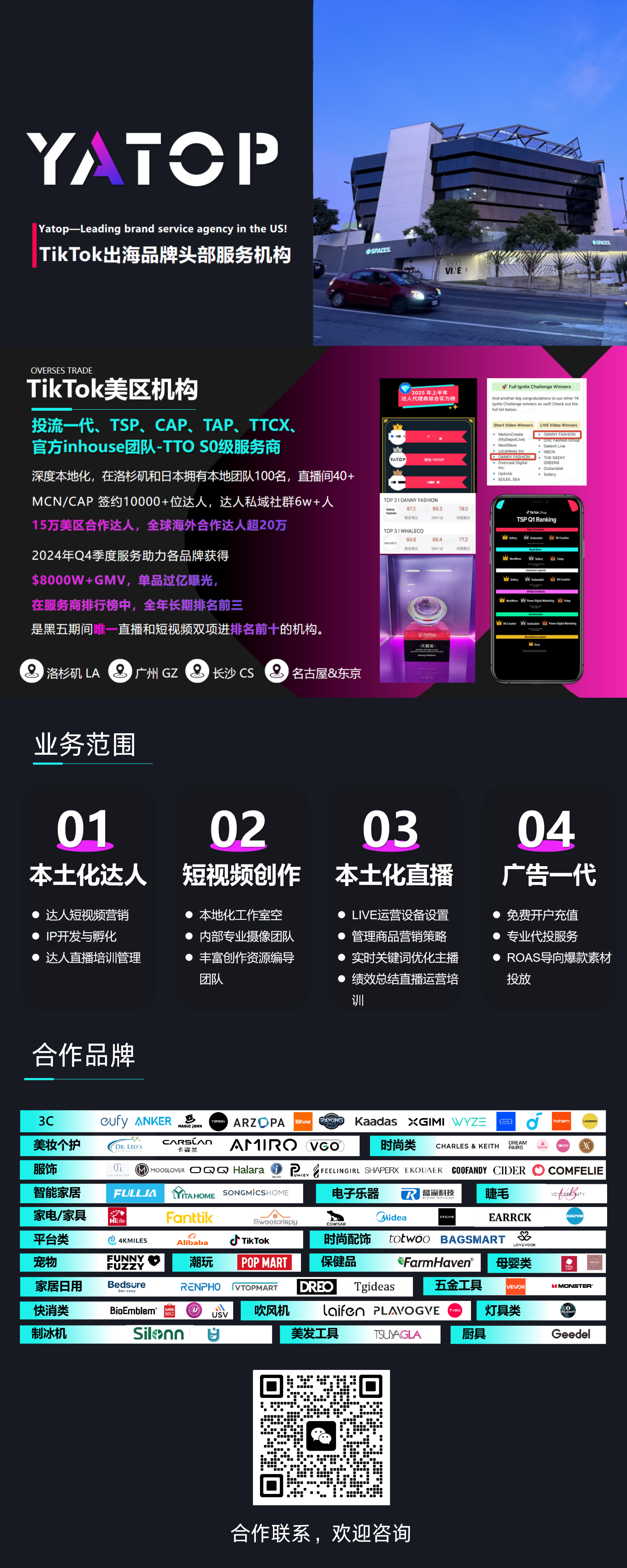 我们是美区 TikTok头部服务机构雅拓Yatop,美区 前三TSP、直播机构,全球tiktok广告一代