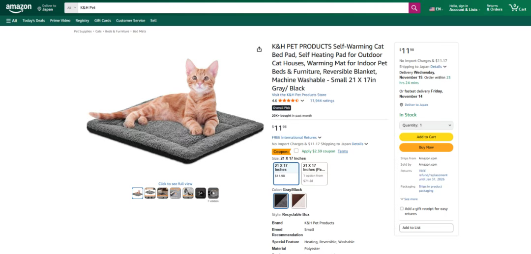 K&H Pet Products作为全球可加热宠物床市场的主要参与者之一,目前官网上的一款加热猫咪垫已显示“脱销”状态。亚马逊平台上,其一款售价为11.98的自热宠物垫,过去一个月售出超20000件。