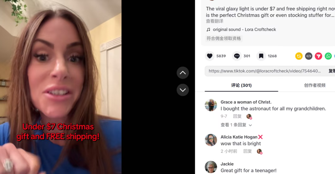 头部达人领跑:粉丝量13万的达人loracroftcheck单账号带货524件,贡献销售额30.98万美元,其发布的“7美元圣诞礼+免运费”视频收获5839次转发、301条评论,评论区满是“已给孙辈下单”“太适合送青少年”“这个作为圣诞礼物十分好”的求购留言,单条视频直接拉动上千笔成交。