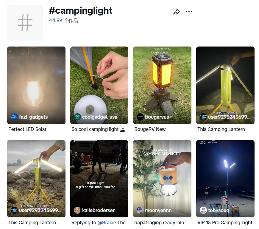 在TikTok上,随手搜索#campinglight(露营灯)、#emergencylight(应急灯)等相关话题标签,动辄便有数千万甚至上亿的播放量,海量用户自发分享的使用场景和开箱视频,每天都在制造新的消费热点。