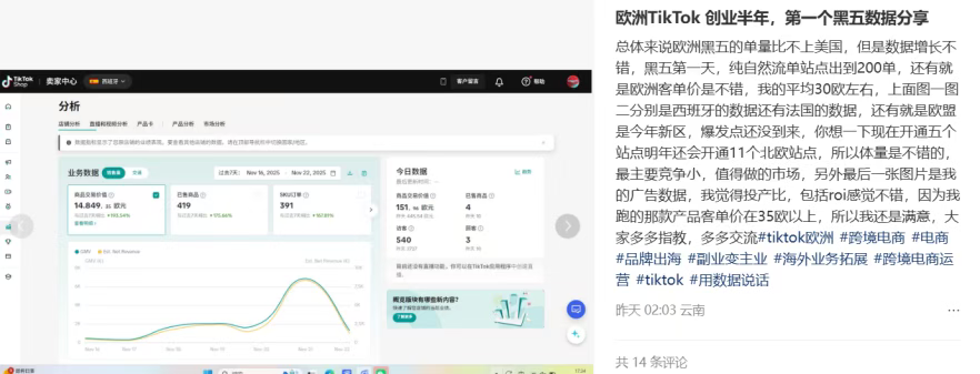 有TikTok Shop欧洲站卖家分享:“黑五第一天,纯自然流单站点出到200单”,客单价与ROI均令人满意;玩具品类卖家更是迎来爆发,订单从平日数百单猛增至两千多单。