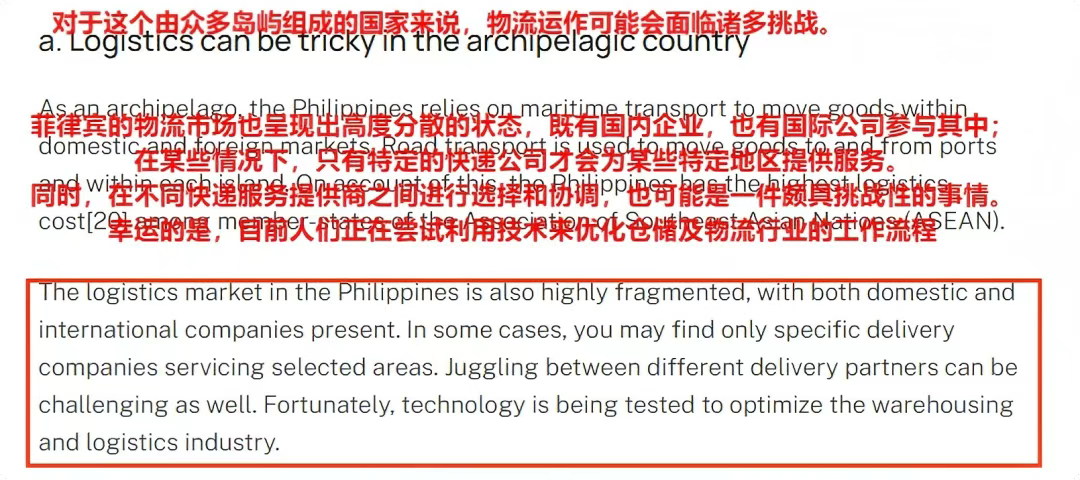 而在Anchanto的菲律宾电商报告中,也清晰地指出了,菲律宾作为群岛国家,市场呈现出高度的分散性,这种地理形态带来的直接问题是——物流成本高、配送周期长、覆盖不均。很多二三线岛屿的配送时效,仍然在“周级配送”阶段。